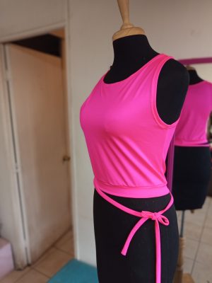Llamativo top talla M confeccionado el lycra dupont estampada. El color base es rosado y tiene matices dorados y rojos.